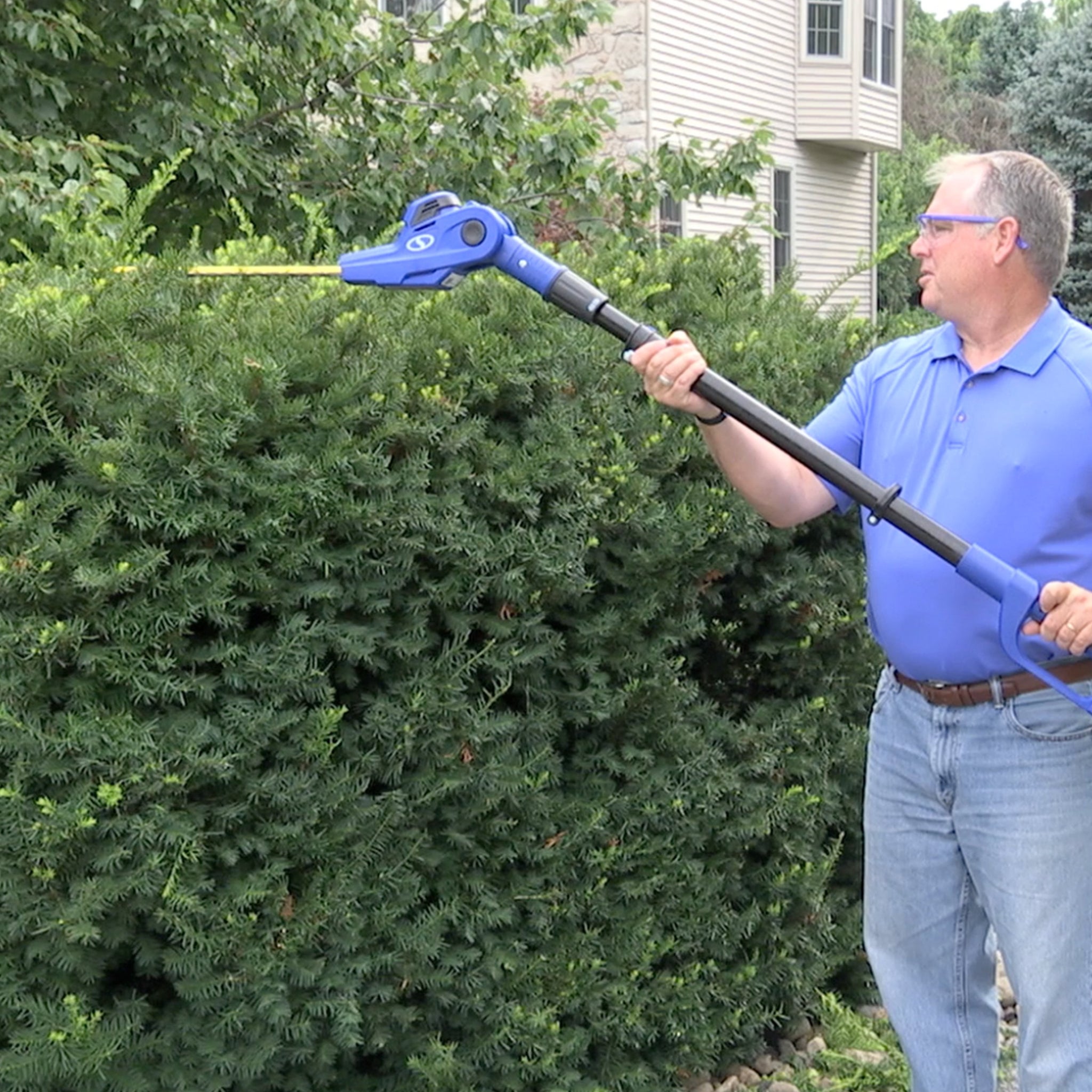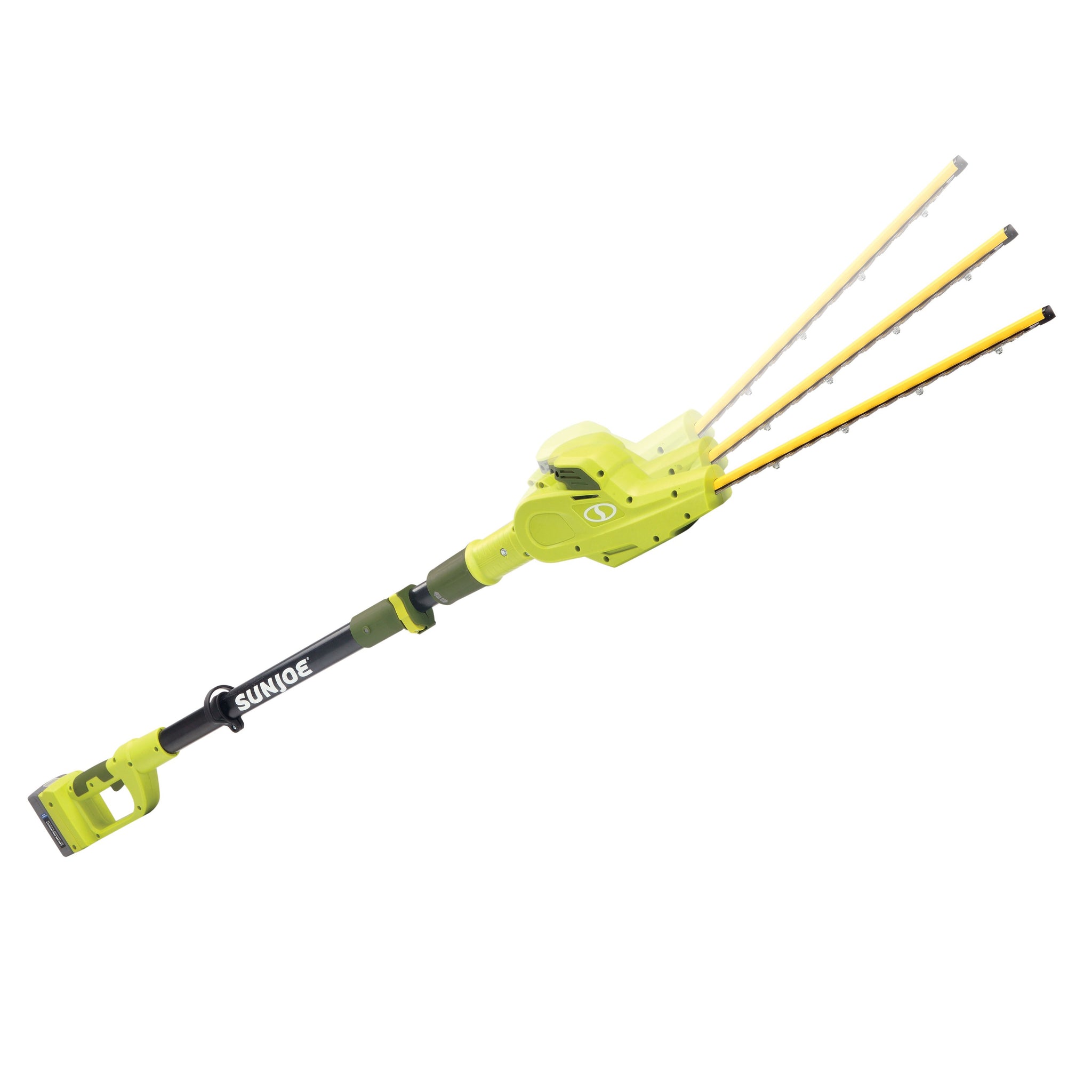 SUN JOE's multi-angle pivoting head allows for precise trimming of most tall bushes and hedges. 20ViONLTE-PHT17’s 17-inch dual action, rust-resistant steel blades cut efficiently in both directions, and the telescoping pole adjusts from 6 ft to 7.9 feet for up to 12.5 feet of overhead reach. And when you’re ready to go low, simply pivot the head and point the pole down to work beneath the bushes.