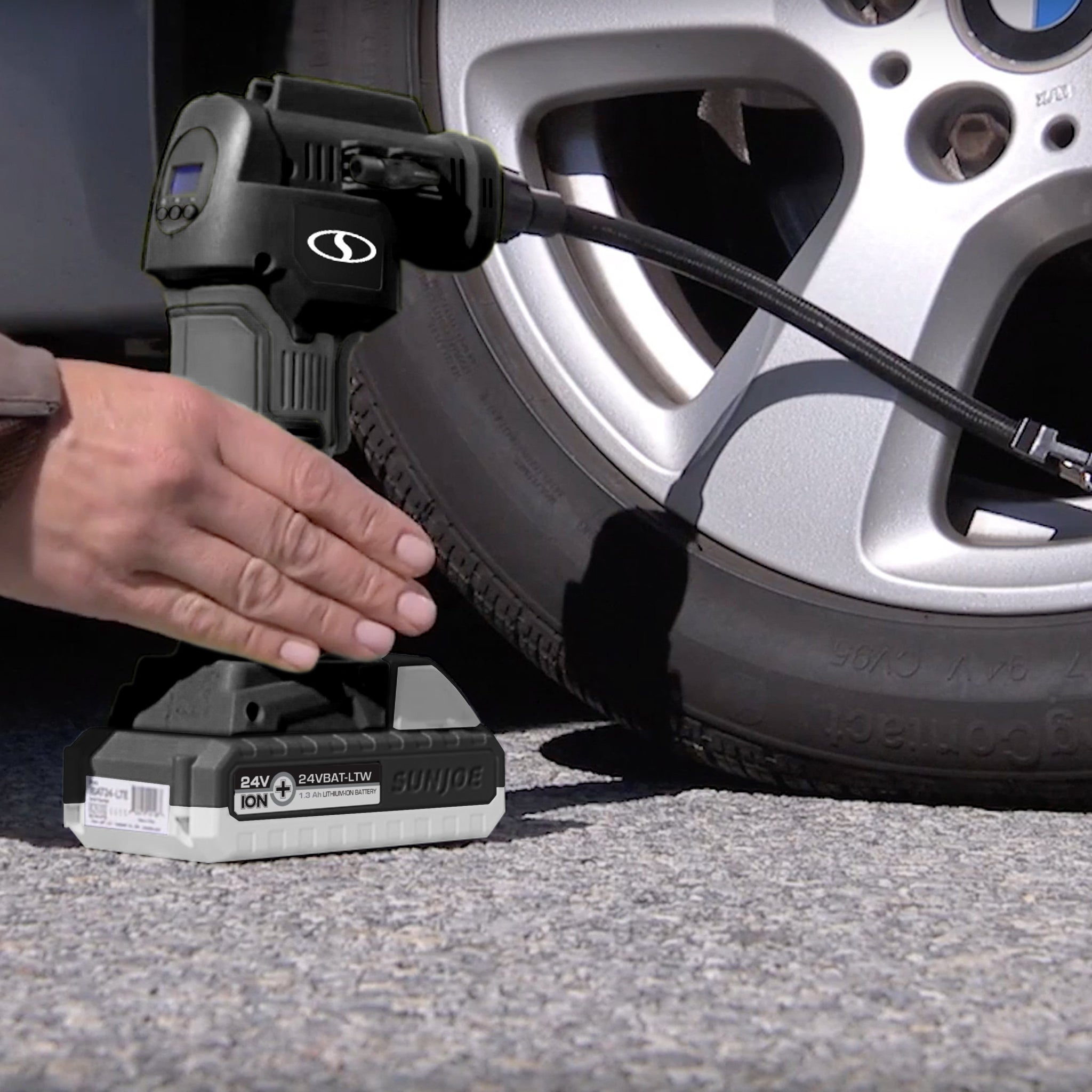 Skip the trip to the gas station and reach for the powerful portable air compressor that fits in the palm of your hand with the 24V-AJC-LTW 24-Volt Cordless Air Compressor from SUN JOE.