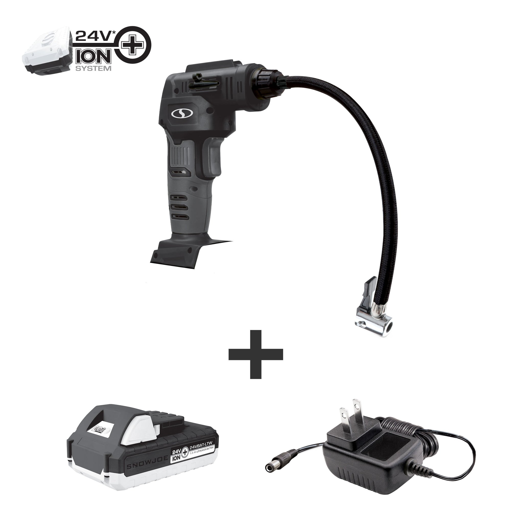 Sun Joe 24V-AJC-LTW-BLK 24-Volt iON+ Cordless Portable Air Comporessor Kit | W/ 1.3-Ah Battery, Charger, Storage Bag, and Nozzle Adapters (Black)