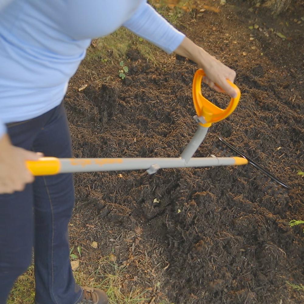 Make yard work easier on yourself with this innovative rake. The added handle that connects to the steel shaft helps reduce the strain on your body so you can work longer. And the 16 steel tines make it easier to rake rougher debris. That's the smarter way to do yard work. By Sun Joe.