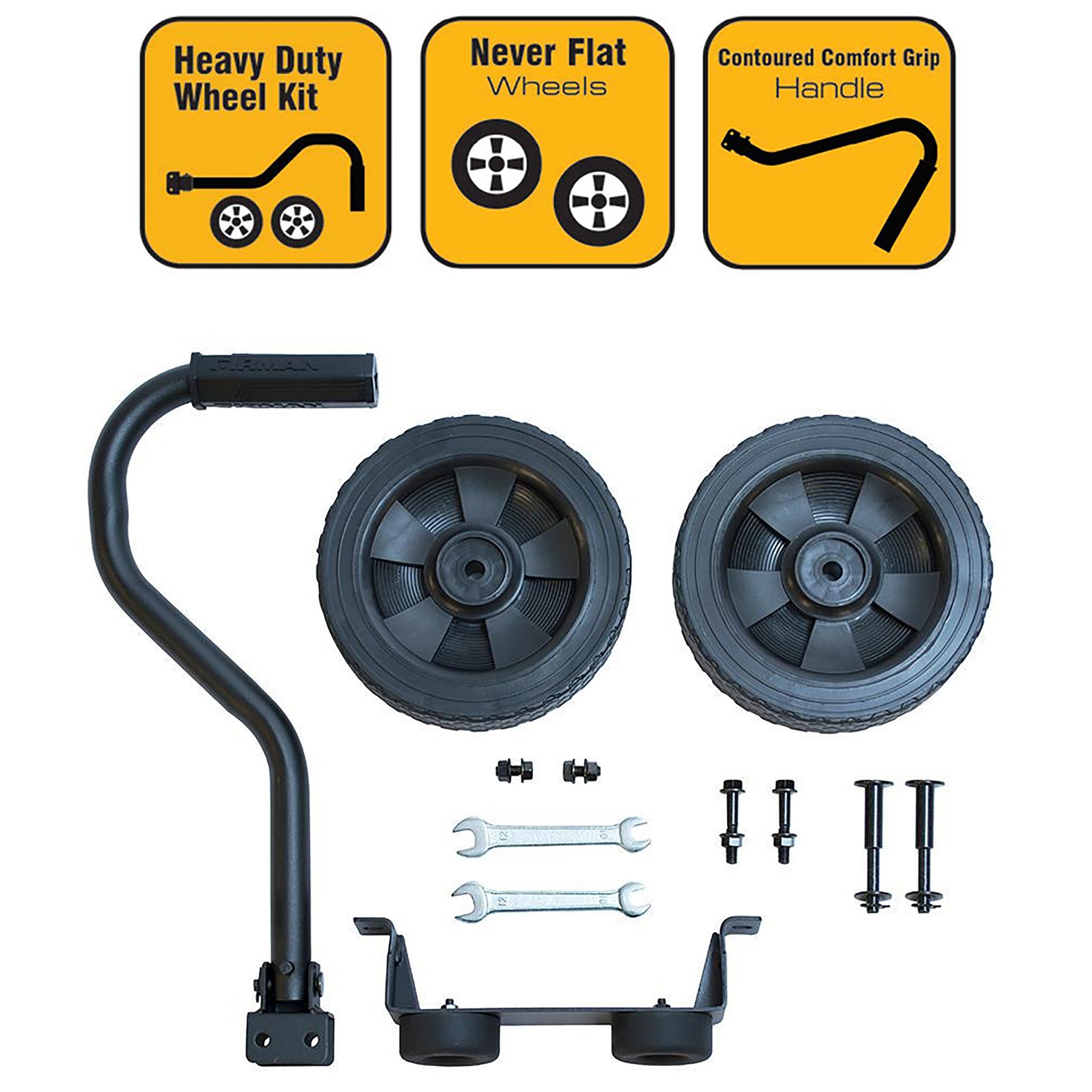 Made specifically for FIRMAN Power Equipment Generators, this wheel kit was designed for ease of portability, strength, and durability. Includes 2 8.0" Never Flat Wheels with Axle Pin for easy installation, high leverage Single Folding Handle with Grip for easy maneuvering, supporting leg with Rubber Mounts to reduce vibration, and all hardware and tools necessary for assembly.