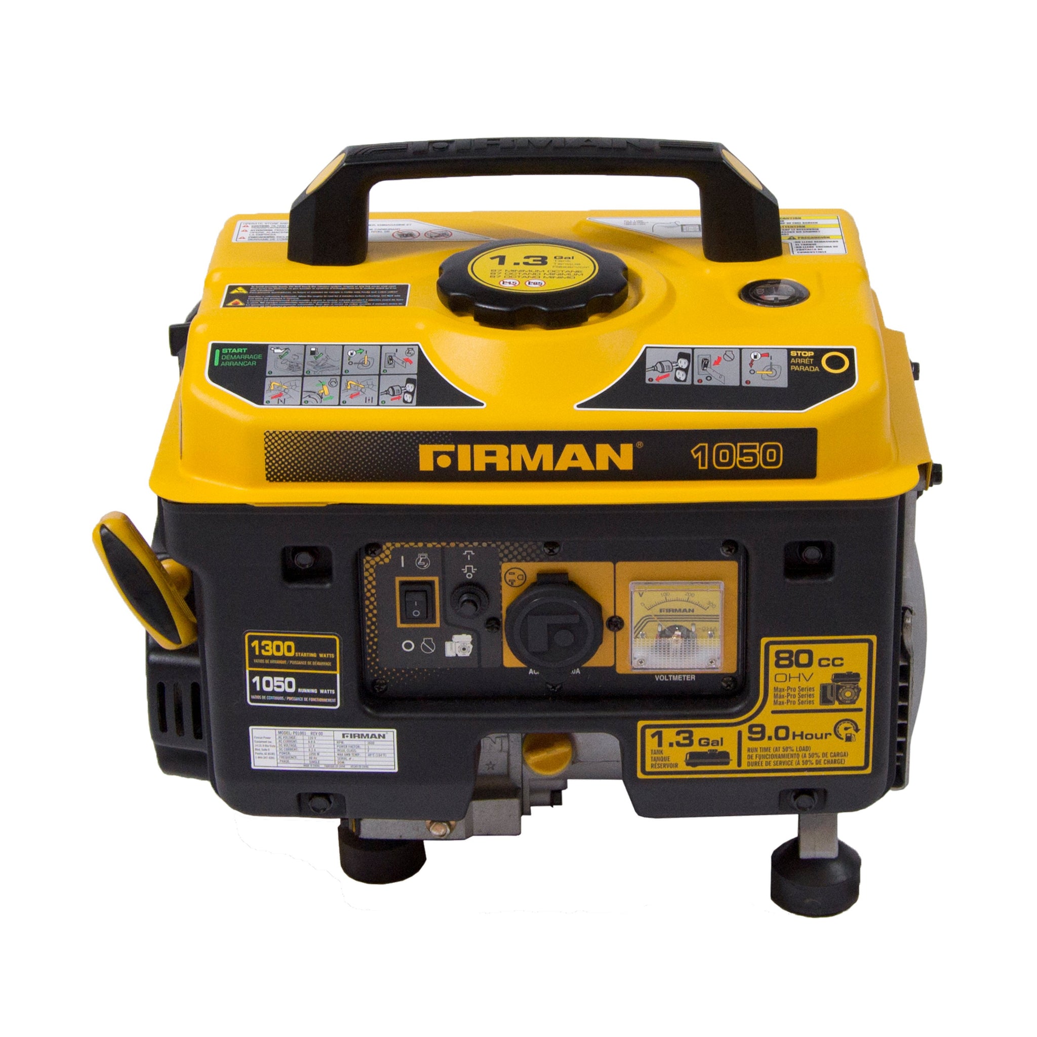 Perfect for camping, tailgating, or when you need power on the go. The FIRMAN P01001 generator features 1300 starting Watts and 1050 running watts. Power is supplied by our Max Pro Series 80cc FIRMAN engine which runs cool and efficient thanks to its Phoenix Fat Head Block. Our Whisper Series muffler keeps the P01001 running a quiet 63 decibels – well below the standards set by the National Parks Service, and our spark arrester has been approved by the USDA Forest Service. The industry-leading 1.3 gallon fuel capacity provides a whopping 9 hours of run time. Our rubberized Thresher handle makes recoil starting a snap – even with bulky gloves.