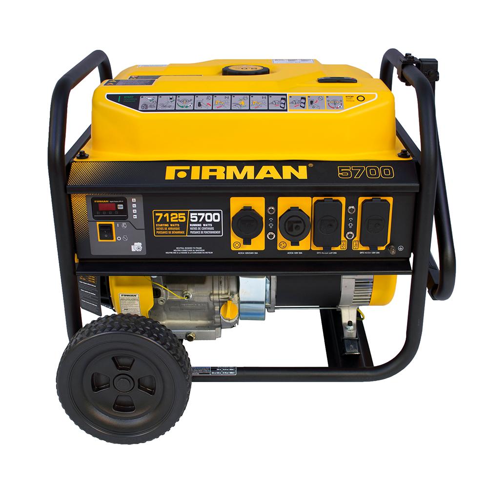 The FIRMAN Volt Lock automatic voltage regulator ensures clean, consistent power output from the FIRMAN Power Stream alternator. For the ultimate in portability the P05701 includes a wheel kit featuring 10” never-flat wheels and a high leverage single folding handle with ergonomic grip. Pertinent information is at your fingertips with our 4-in-1 data minder measuring Volts, Hertz, Hours and a low oil indicator. The durable, compact tubular roll cage frame design is built for years of use. Just add gas! Everything you need comes standard in the box including: oil, funnel, owner’s manual, spark plug wrench, and two wrenches to remove protective shipping brackets.