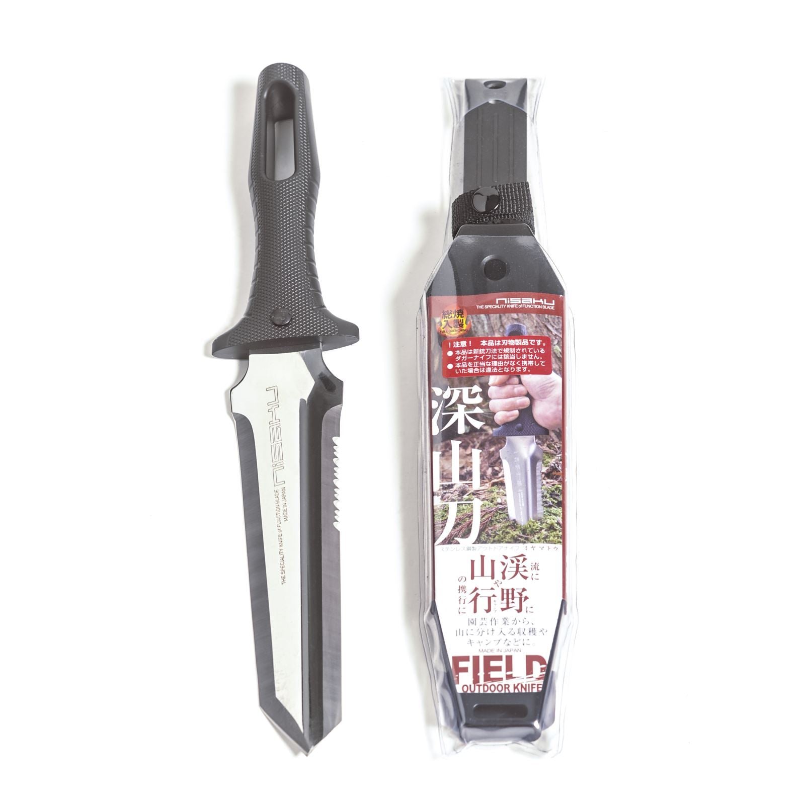 The Nisaku Japanese Stainless Steel Miyamatou is an excellent multi-functional tool for a wide variety of outdoor applications. The sharp, stainless steel half serrated blade with cupped shape digging blade and double edged design is the ultimate in survival, camping, outdoor and general purpose knives. Includes a hard sheath with belt loop. Handle has a convenient lanyard loop hole.