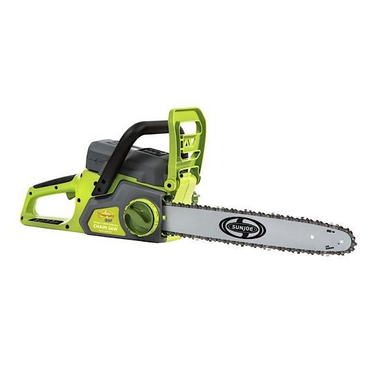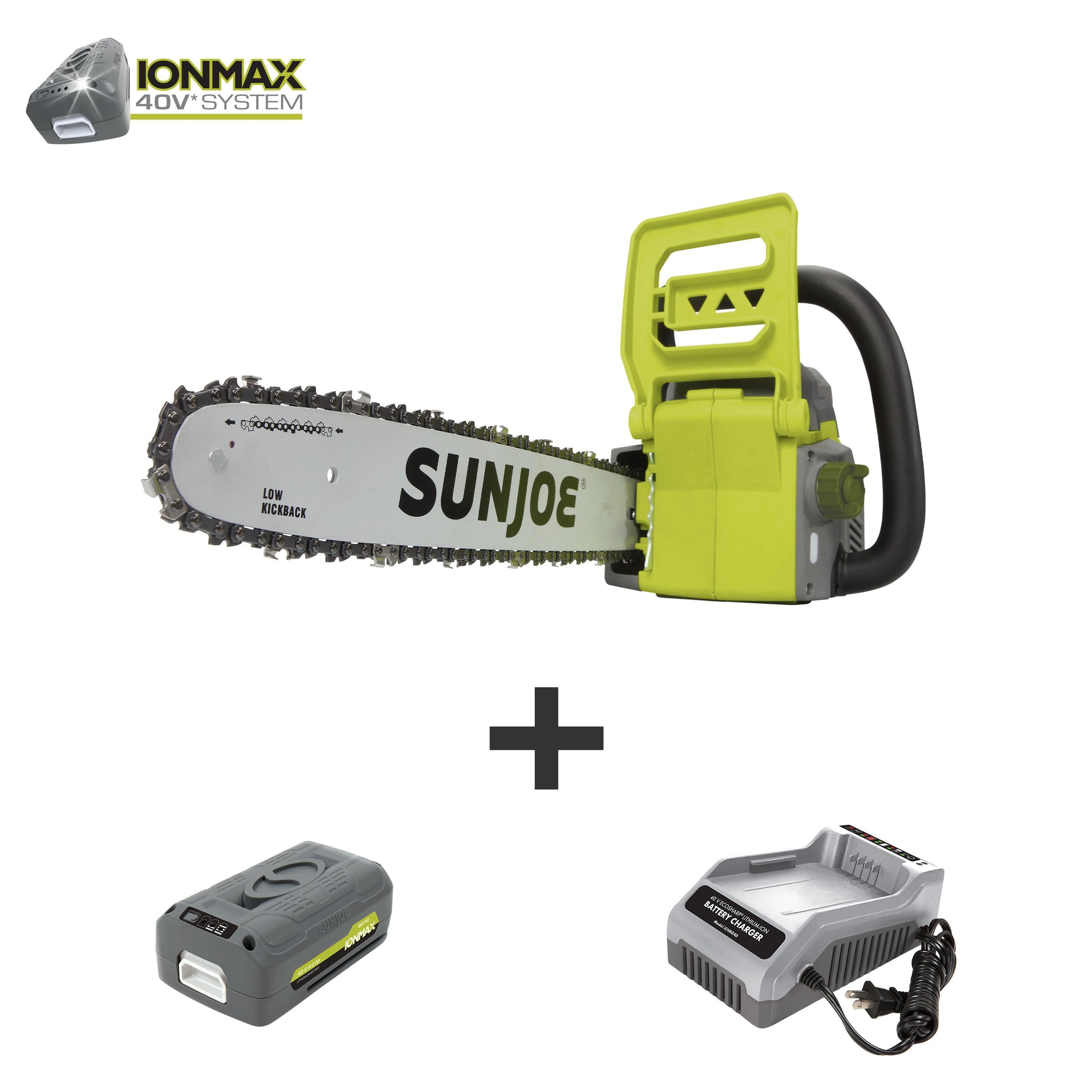 CUT OFF. Tackle tough cutting jobs with the newest addition to the iON tool series – the Sun Joe® iON16CS cordless chain saw! Powered by the same interchangeable 40 V EcoSharp® lithium-ion battery system utilized by the other iON tools, the iON16CS delivers up to 40 minutes of whisper-quiet runtime with zero carbon emissions for cleaner air. This cordless dynamo is also engineered with a powerful 600 W brushless motor for increased battery efficiency, optimal motor performance and extended motor life to keep your iON chain saw sawing strong season after season.