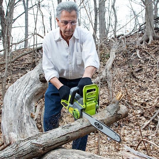 Ideal for cutting thick limbs, firewood, logs and branches, the iON chain saw starts instantly with a simple push of a button and its lightweight, ergonomic design (only 12.8 lbs!) maximizes user comfort during use. Featuring a self-lubricating 16-inch Oregon cutting bar and chain, the iON chain saw can easily saw through the most stubborn tree limbs, up to 14.6-inches thick! And, its tool-less chain adjustment system makes operation virtually maintenance free! Safety features include a hand guard with kickback brake, a protective sheath for safe blade storage, and a built-in safety switch to prevent accidental starting. Marked with the ETL and Energy Star seal of approval, the Sun Joe® iON16CS 40-volt 16-inch cordless chain saw makes it easy to GET EQUIPPED® for a variety of outdoor cutting chores.