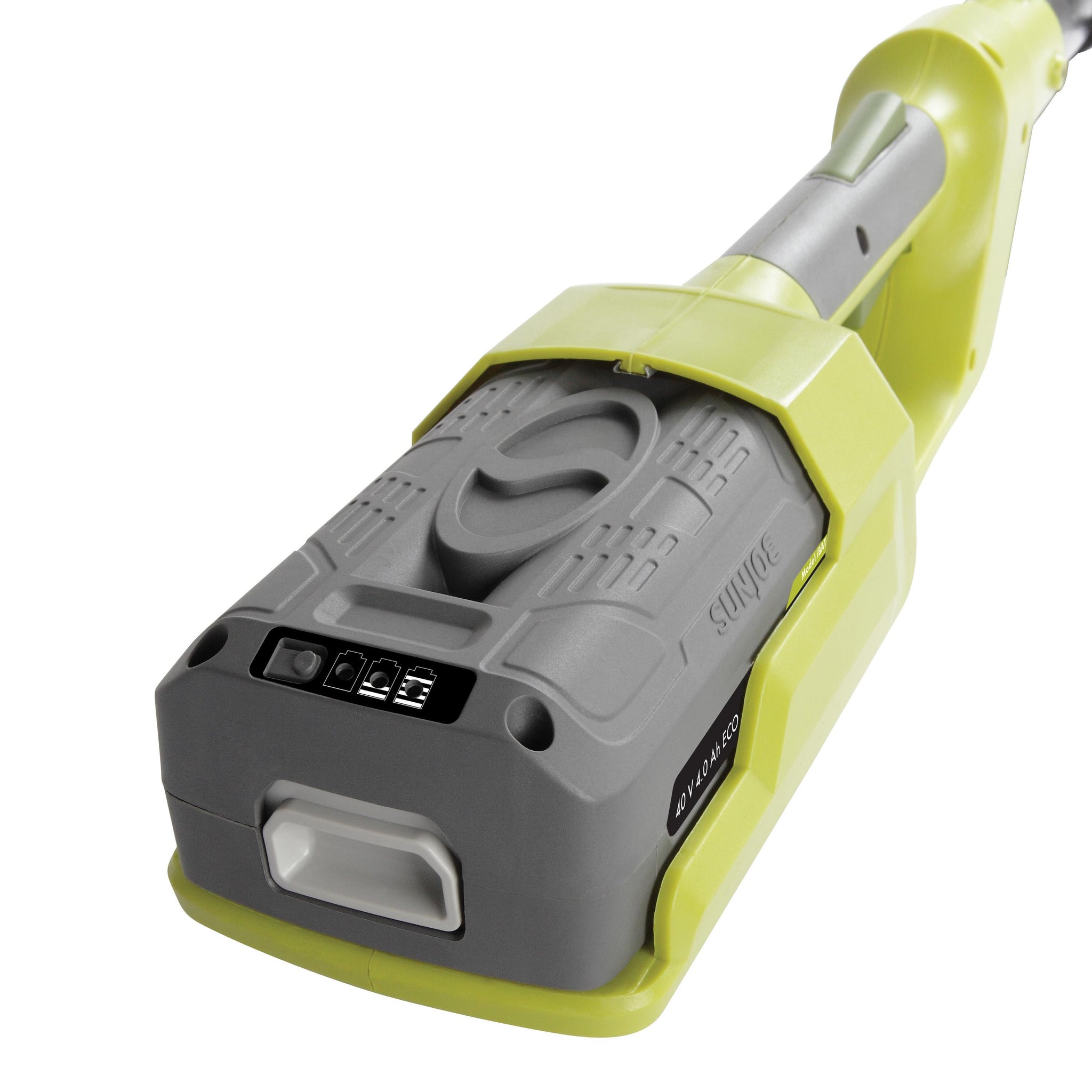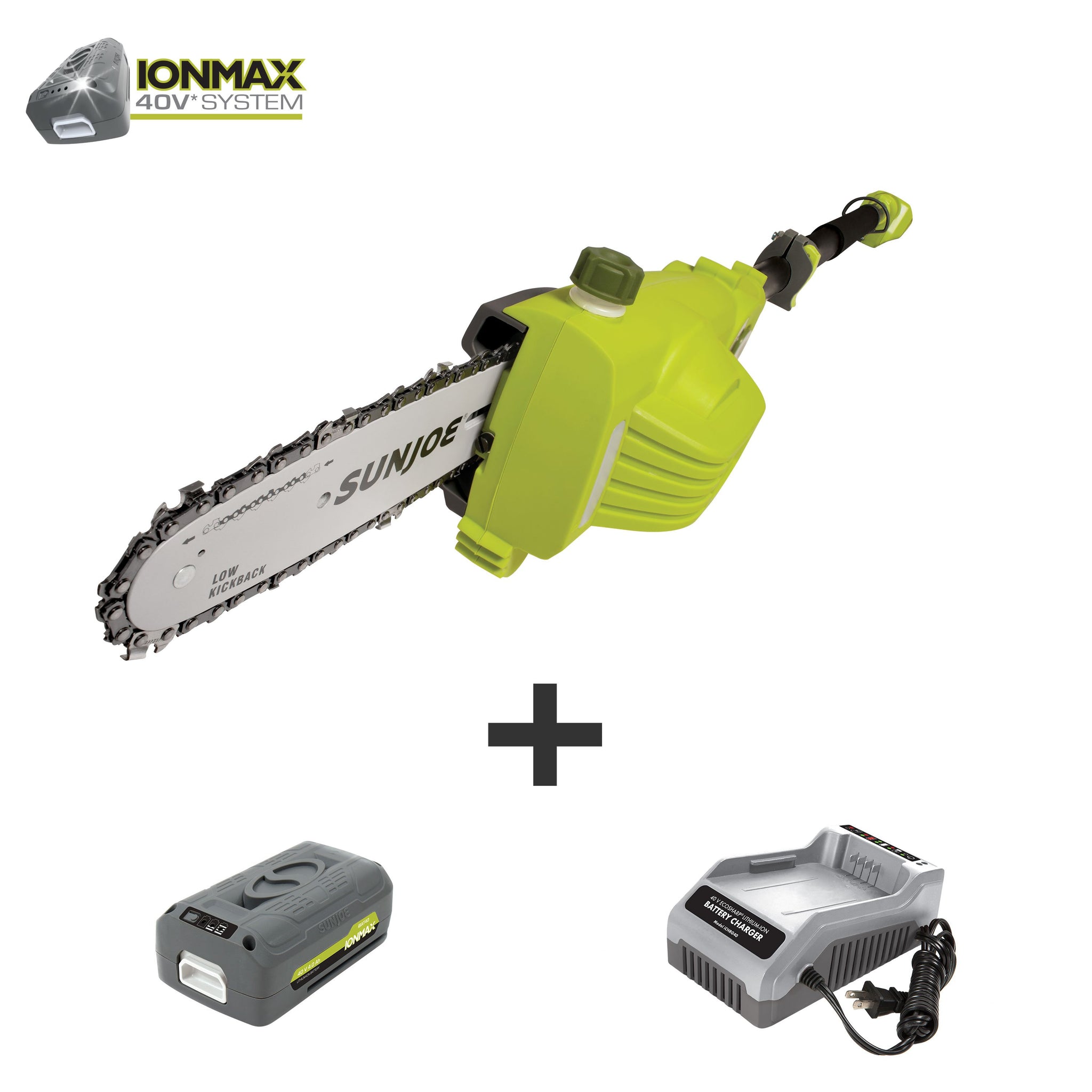 A CUT ABOVE THE REST. The Sun Joe® iON8PS2 cordless pole chain saw makes it quick and easy to trim your overgrown trees. Powered by the same interchangeable 40 V EcoSharp® battery utilized by the other tools in the iON series, the iON8PS2 provides the cutting performance of a comparable gas- or electric-powered unit with the convenience and freedom of a lightweight (only 8.6 lbs!) cordless device. Operation is simple:
