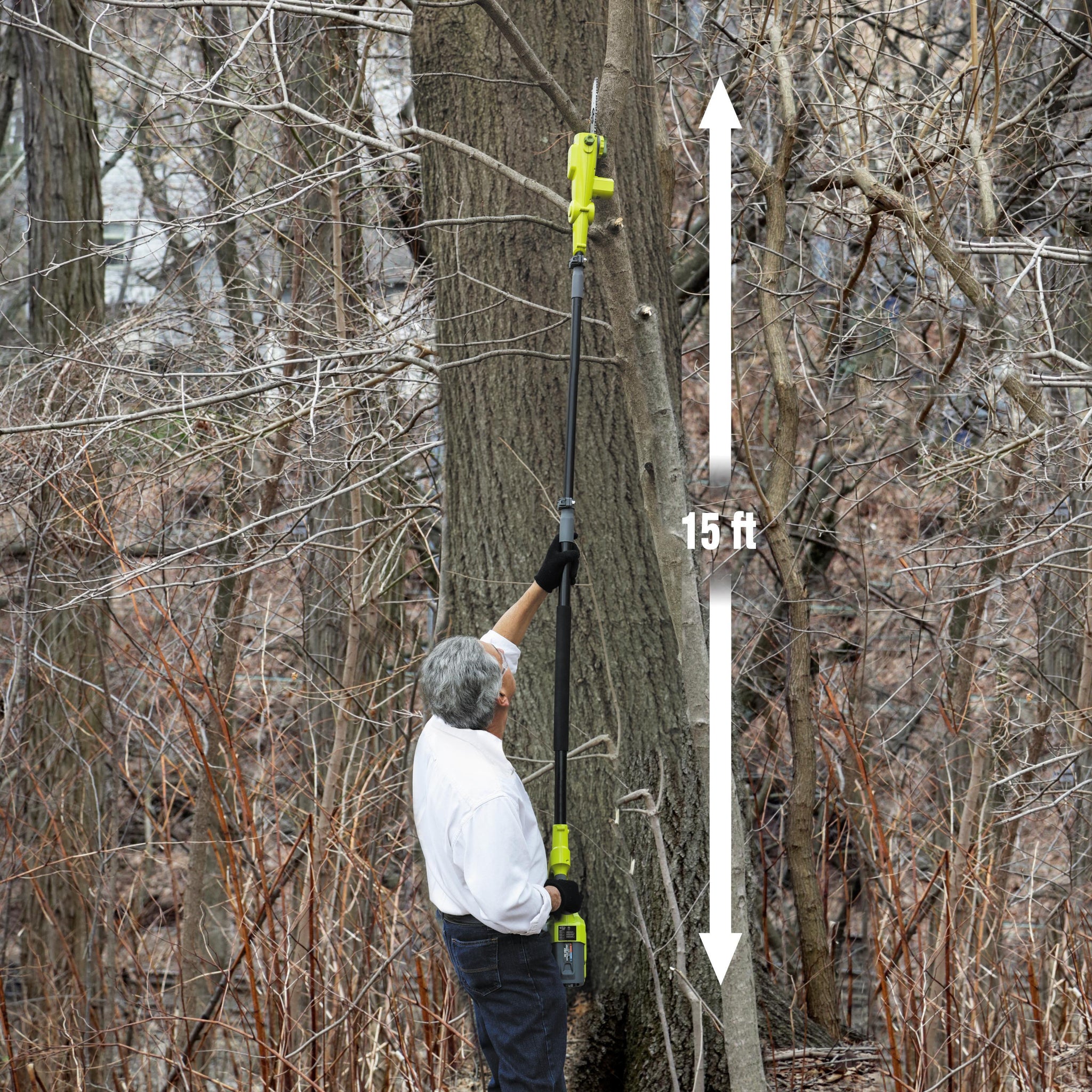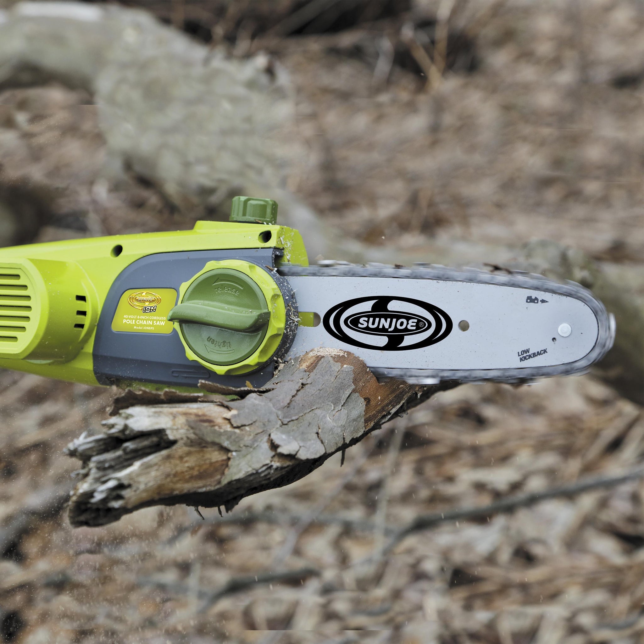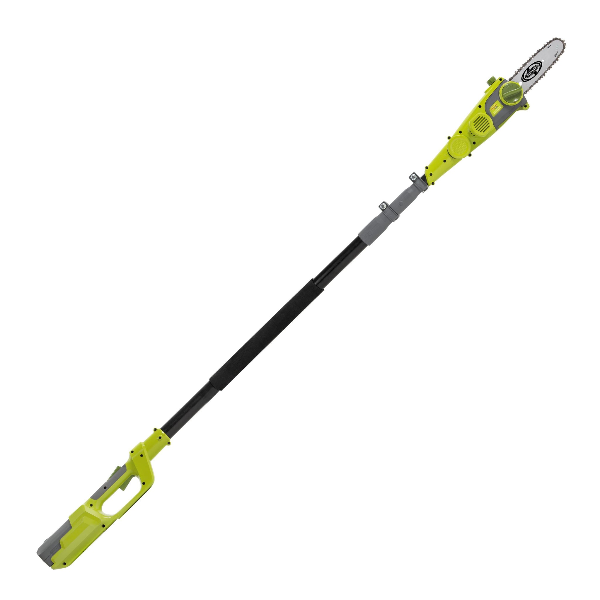 LET GRAVITY DO THE WORK™ The Sun Joe® iON8PS cordless pole chain saw makes it quick and easy to trim your overgrown trees. Powered by the same interchangeable 40 V EcoSharp® battery utilized by the other tools in the iON series, the iON8PS provides the cutting performance of a comparable gas- or electric-powered unit with the convenience and freedom of a lightweight (only 10.8 lbs!) cordless device. Operation is simple: SLIDE the telescoping pole (adjustable from 6.2 ft to 9.8 ft) to your desired length, ADJUST its 30º rotatable head to the optimal cutting position, PUSH a button to power on, and WATCH its 8-inch self-lubricating Oregon cutting bar and chain make quick work out of overhanging tree limbs up to 7.1-inches thick, all while you stand safely on solid ground!