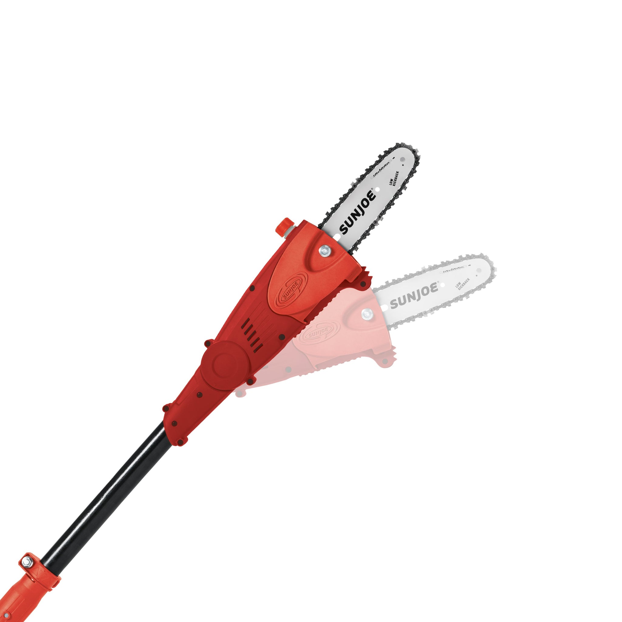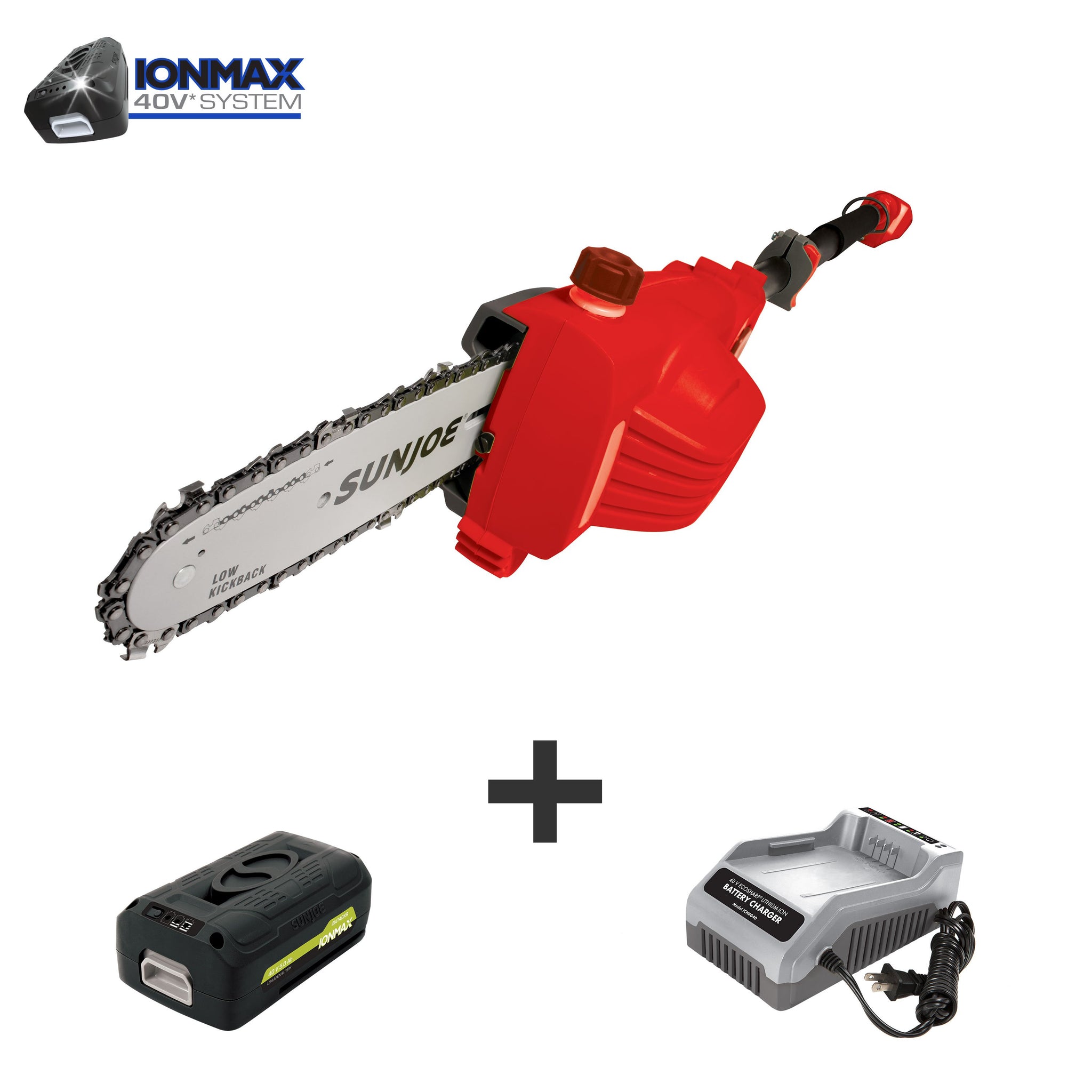 A CUT ABOVE THE REST. The Sun Joe® iON8PS2-LT-RED cordless pole chain saw makes it quick and easy to trim your overgrown trees. Powered by the same interchangeable 40 V EcoSharp® battery utilized by the other tools in the iON series, the iON8PS2-LT-RED provides the cutting performance of a comparable gas- or electric-powered unit with the convenience and freedom of a lightweight (only 8.5 lbs!) cordless device. Operation is simple: