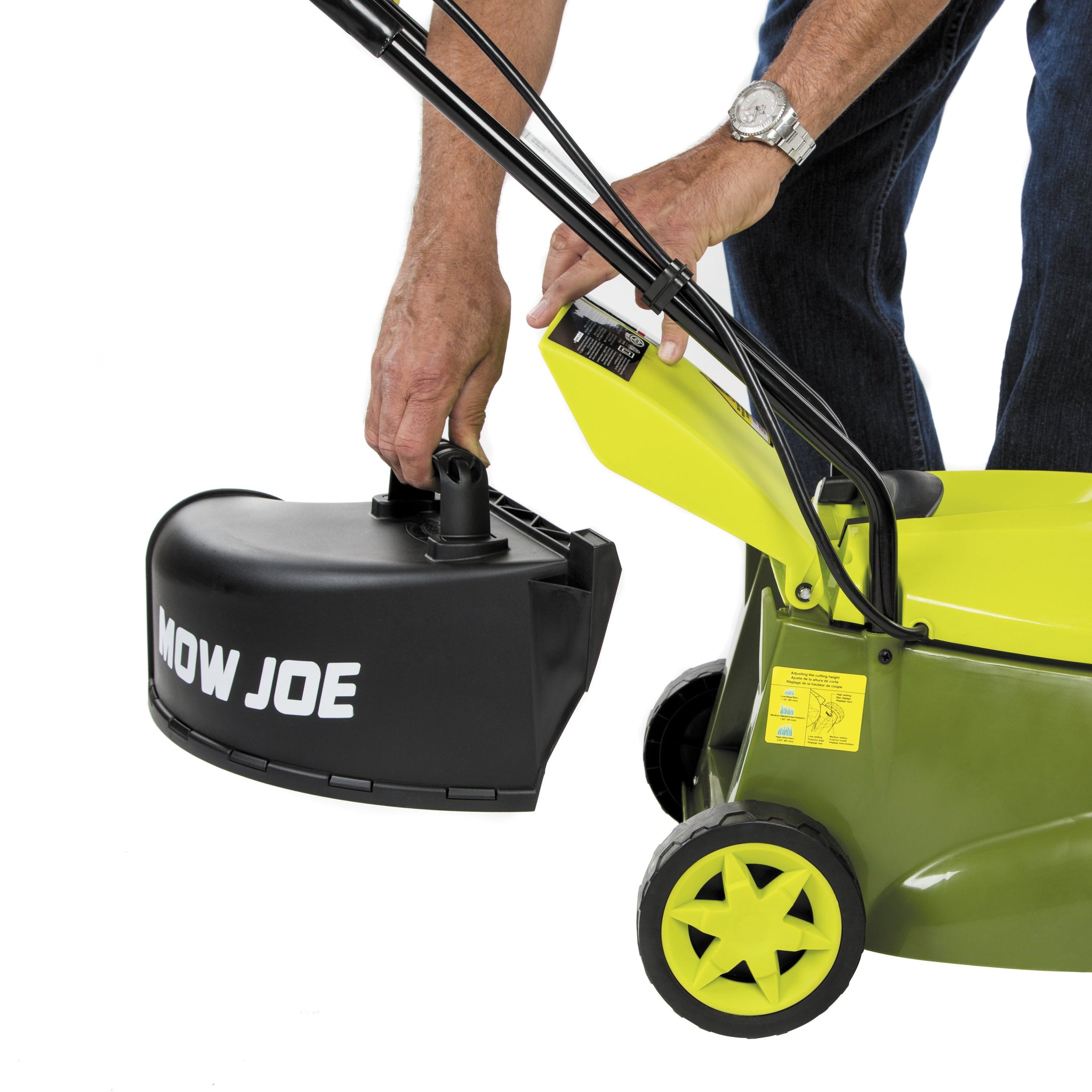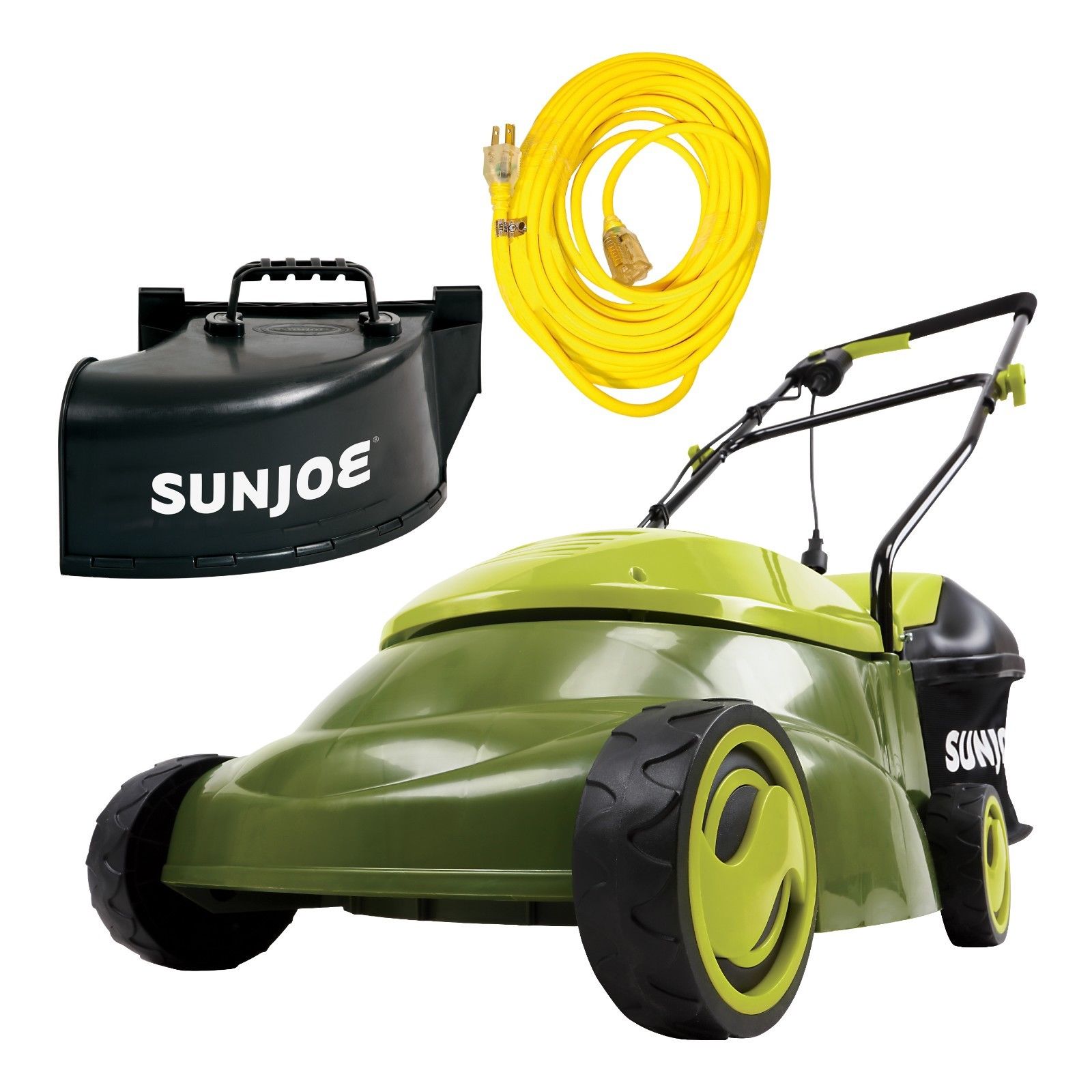 GREAT IN TIGHT SPACES! Responding to the need for an easy-to-use electric mower for smaller lawns, Sun Joe developed the MJ401E. Compact and lightweight (only 29 lbs), the MJ401E is a lean, mean and green mowing machine that gets your yard chore done without polluting the atmosphere with toxic carbon emissions. Starts instantly with the simple push of a button and its rugged all-terrain wheels make it easy to maneuver in tight spaces. Equipped with a durable steel blade, cuts a 14-inch wide swath with each pass. Tailor the grass cutting height with its 3-position manual height control, which adjusts from 1.18 inches to 2.52 inches. Its 10.6-gallon hard-top rear bag conveniently collects grass clippings and detaches easily for quick disposal. A collapsible handle allows for easy and compact storage when not in use. ETL-approved; This bundle also includes the PJEXT50-B extension cord and MJ401E-DCA side discharge chute.