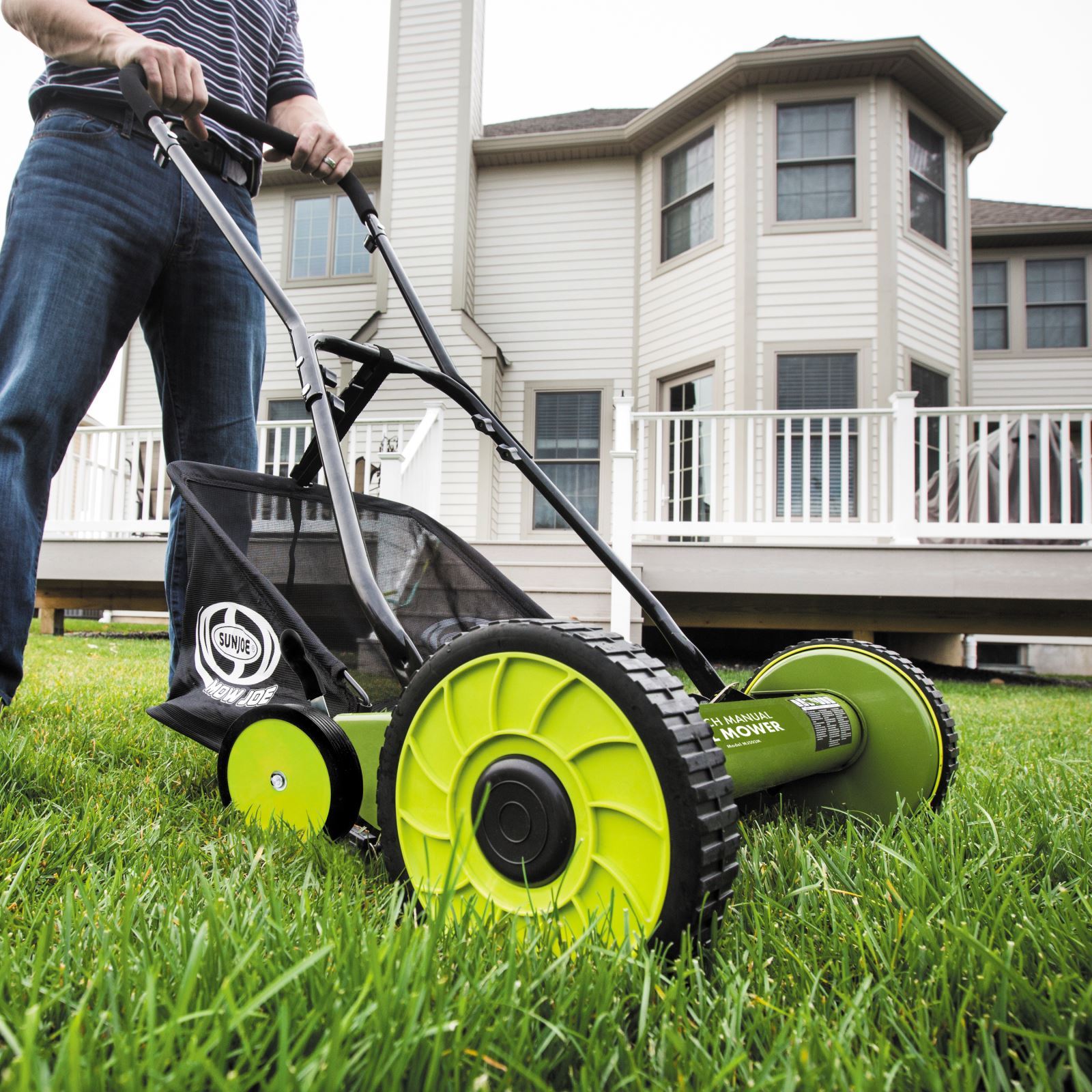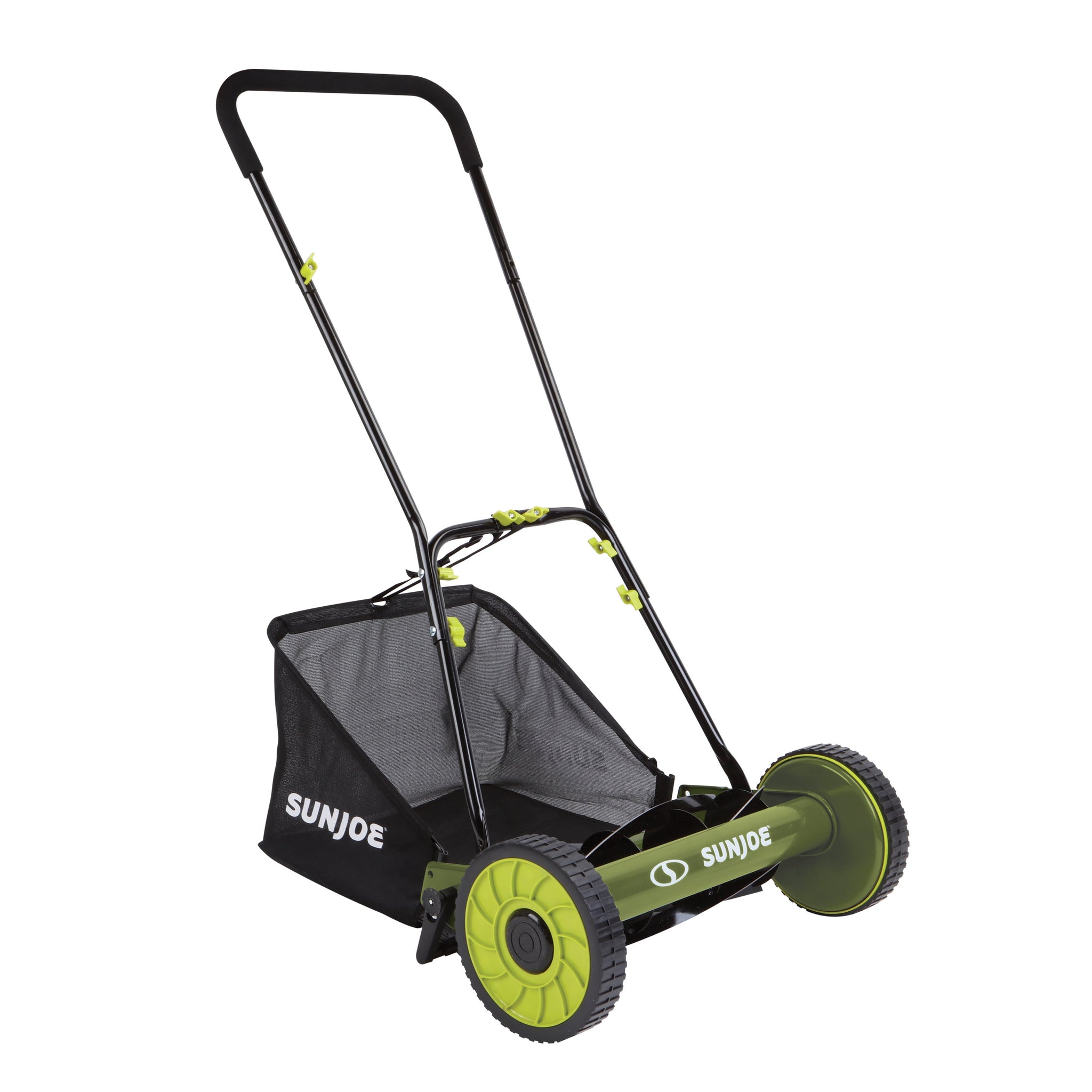 SEE JOE MOW. No messy gas; just an easy-to-use, lightweight, maneuverable and economical push reel mower. The Sun Joe MJ502M-RM Reel Mower with Grass Catcher handles tough turf with ease and provides a quiet, eco-friendly solution for any lawn. The MJ502M-RM comes with a handy rear collection bag to help keep your yard nice and tidy. Powered by you, the Mow Joe MJ502M-RM has an 20-inch wide cutting path and a 9 position height adjustment lever. Tailor cutting heights up to 2.44-inch so you are in complete control of your grass. The mower’s dual wheel design and sharp harden steel blades ensures accuracy and cutting efficiency.